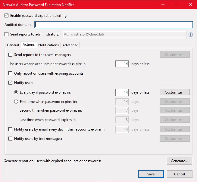 Currently within the Age(Max) rule you can enable the "Send email reminders at x, y and z days before password expiration. This will allow users to notify their users but only three times. I’ve included below the functionality I am requesting be implemented, that is found within the Password Expiration Notifier tool. The Netwrix Auditor Password Expiration Notifier, allows you notify users every day is their password is set to expire within X days or less. I’ve included screenshots of the PPE Age (Max) rule below, as well as the Netwrix Auditor Password Expiration Notifier tool.