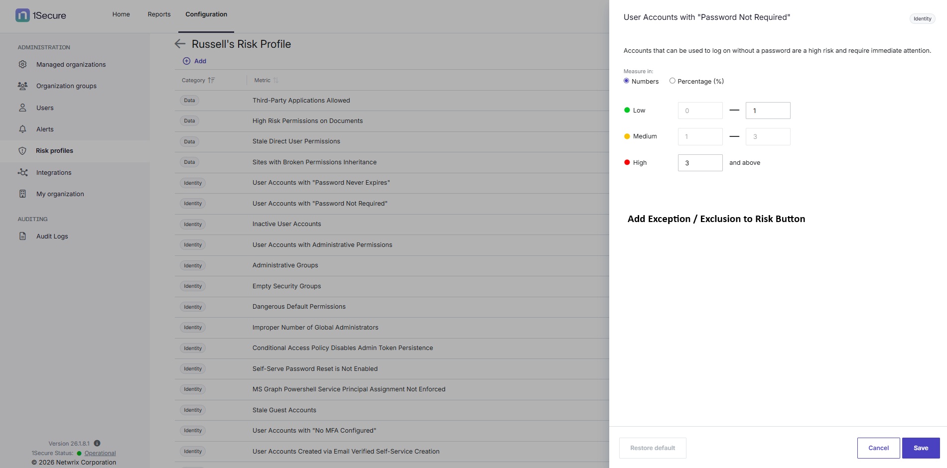For example, Users with Password Set to Never Expire - I am aware of accounts in my organization that this flag will always be set and i consider ‘Not to be a Risk’, but i am unable to exclude such accounts from being shown in the Risk Assessment that skews the results, i can only adjust the threshold in a custom Risk Profile.