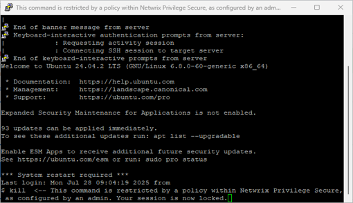 Specific commands can be restricted during SSH sessions using regular expressions. The system evaluates commands in order from top to bottom, applying the first matching rule. Available actions include logging the command, blocking it, locking the session, or terminating the session. Custom lock messages can be configured per command when using the lock action. Email notifications can be sent to NPS administrators whenever a restricted command is triggered. Restrictions are configured in the new Command Restrictions section within the Policy tab.