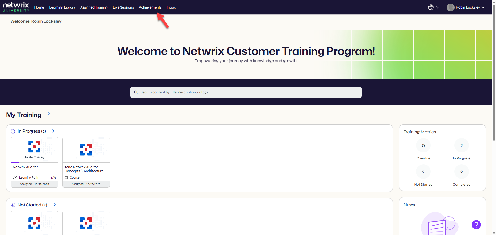 From the Home page of Netwrix University, click Achievements on the horizontal navigation bar at the top of the page, or you can scroll down a little to the Recent Achievements widget in the lower right corner of the dashboard.