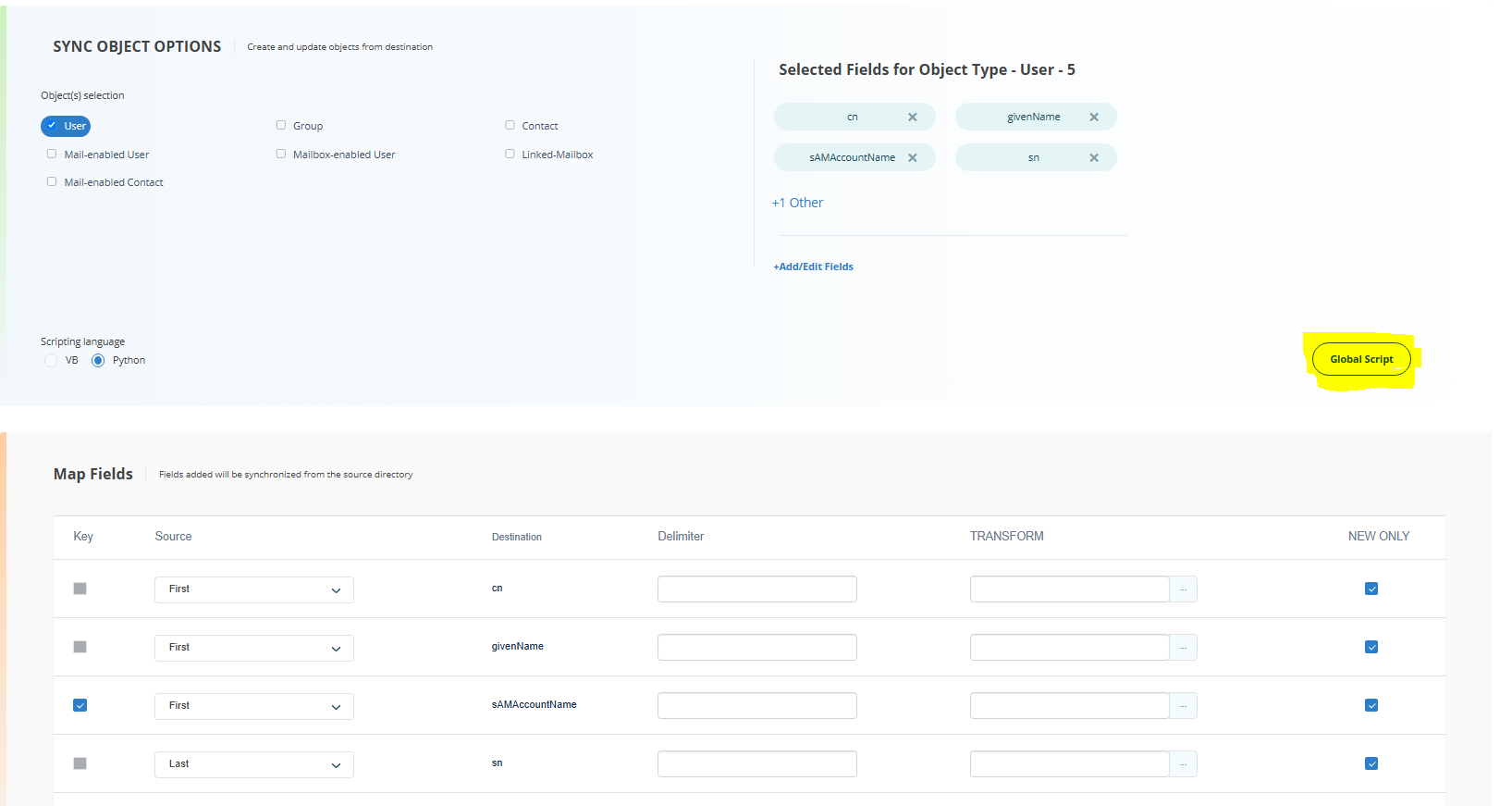 Click the Global Script button. The scripts in Synchronize jobs can be applied at the following levels: