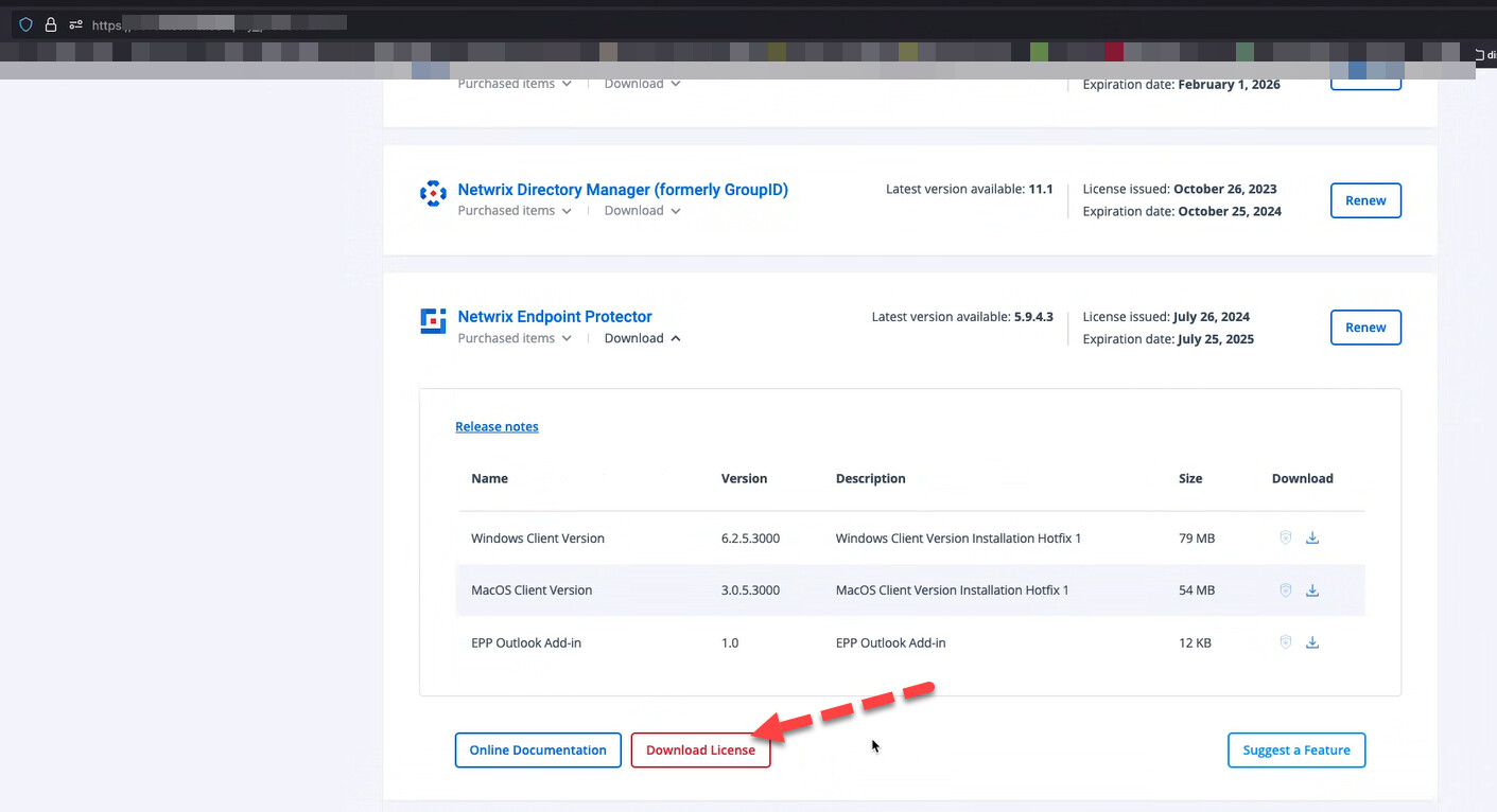 See if your key is present in the Netwrix My_Products portal underneath the Netwrix Endpoint Protector category. Then click Download License like what is seen here.