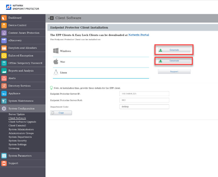 Step 3: (optional): Re-Generate the Windows and/or Mac agents with embedded values for 3rd party software distribution tools. To achieve that please move to System Configuration Client software page, and click âGenerateâ on needed EPP Client version (for macOS and Windows). For Linux, as previously reach out EPP Support.