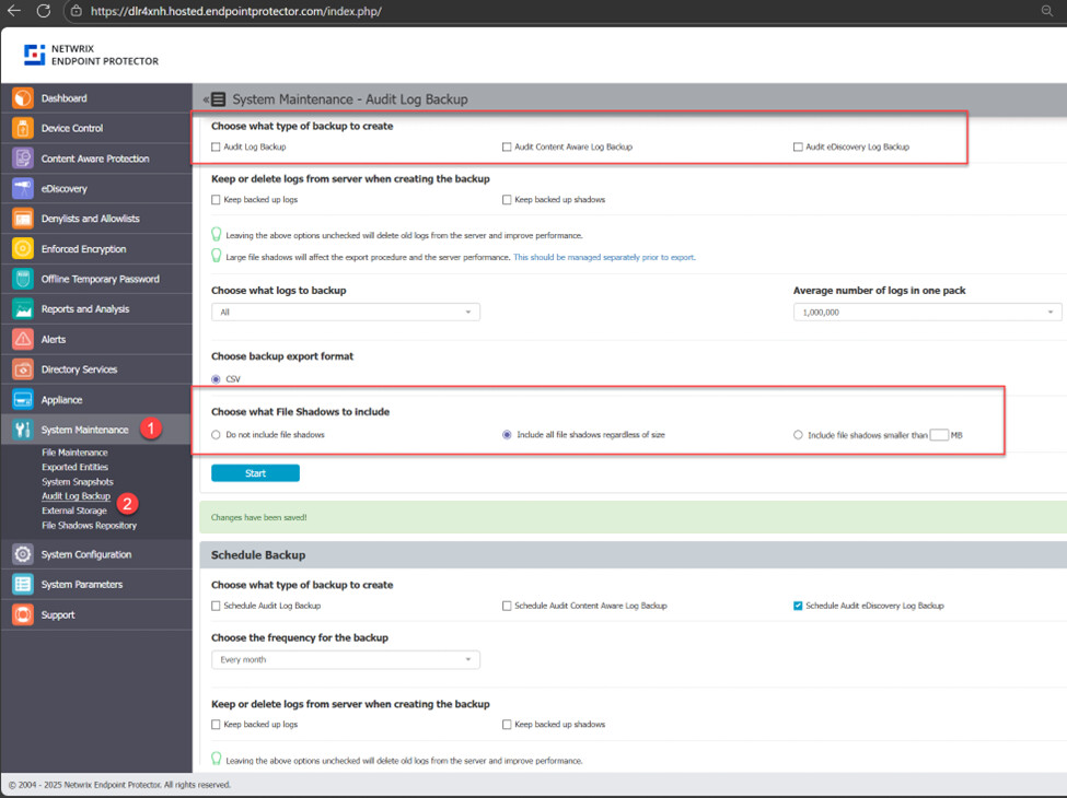 Note: This section is not talking about Audit Log Backup and Audit Backup Scheduler. If you need these logs, we offer several options like what type of logs to backup, how old should the included logs be, to keep or delete them from the server, to include ďŹle shadows or not, etc. https://docs.netwrix.com/docs/endpointprotector/admin/systemmaintenance/overview#audit-log-backup