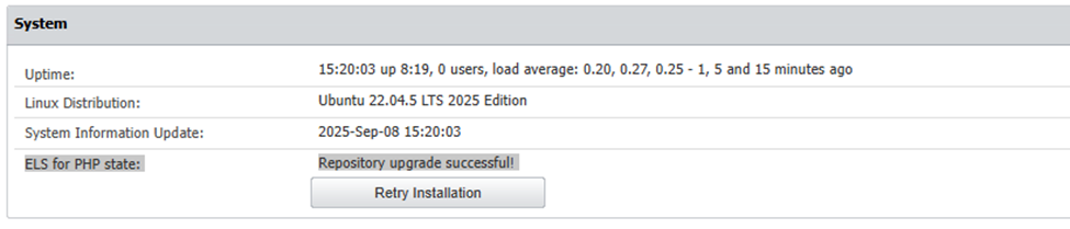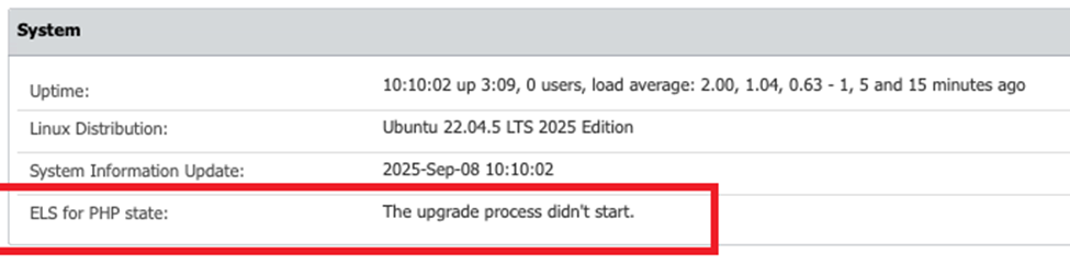 Check the message under ELS for PHP state. If the message is similar to the screenshot below, your license is up to date and underlying security updates to the operating system will be accepted.