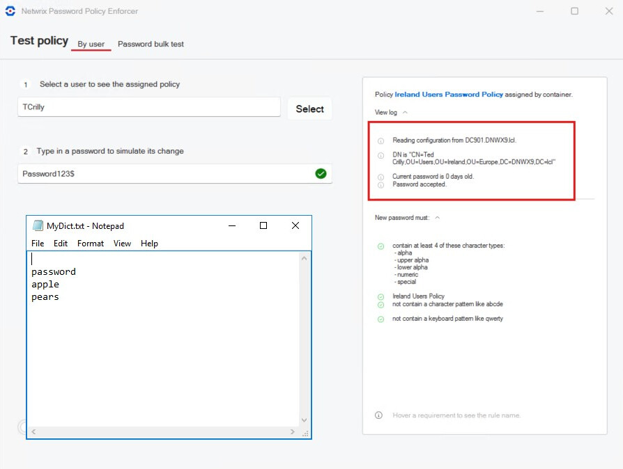 In the screenshot below, using the default dictionary that comes with the platform, a testing a user against the policy you can see the word was identified and rejected.