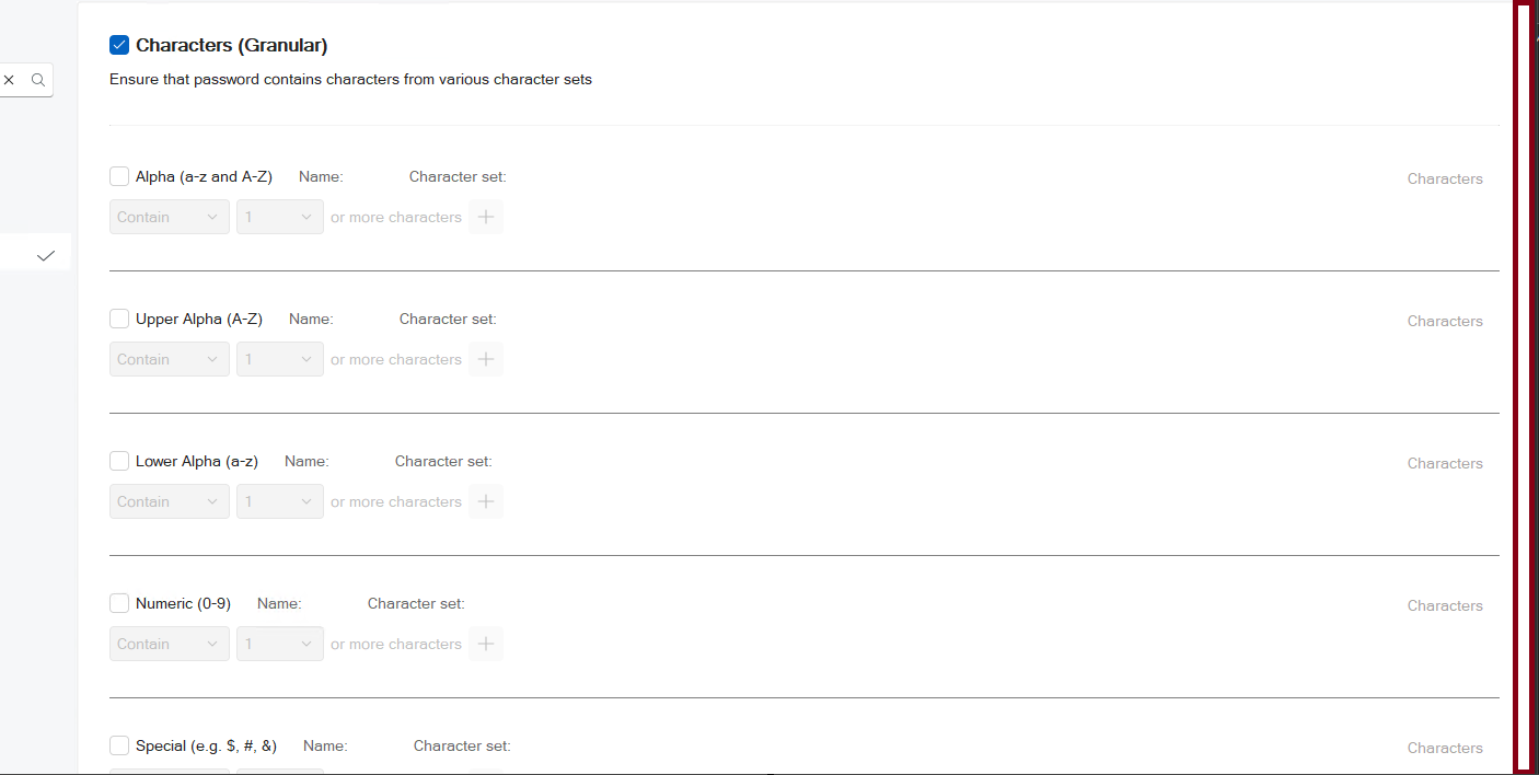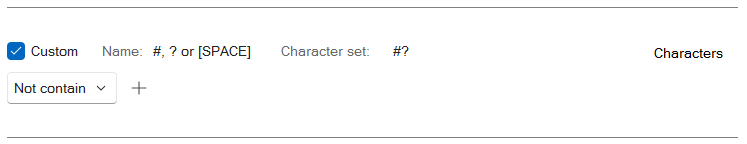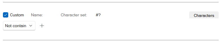 Based on what you are looking to accomplish, this can be achieved through the utilization of the Characters (Granular) rule in a PPE Policy. In the Characters (Granular) rule, you are able to designate the “Not contain” option and the characters button to assign the specific characters you wish to have included in the rule. For this example I used the Custom portion of the Characters (Granular) Rule: