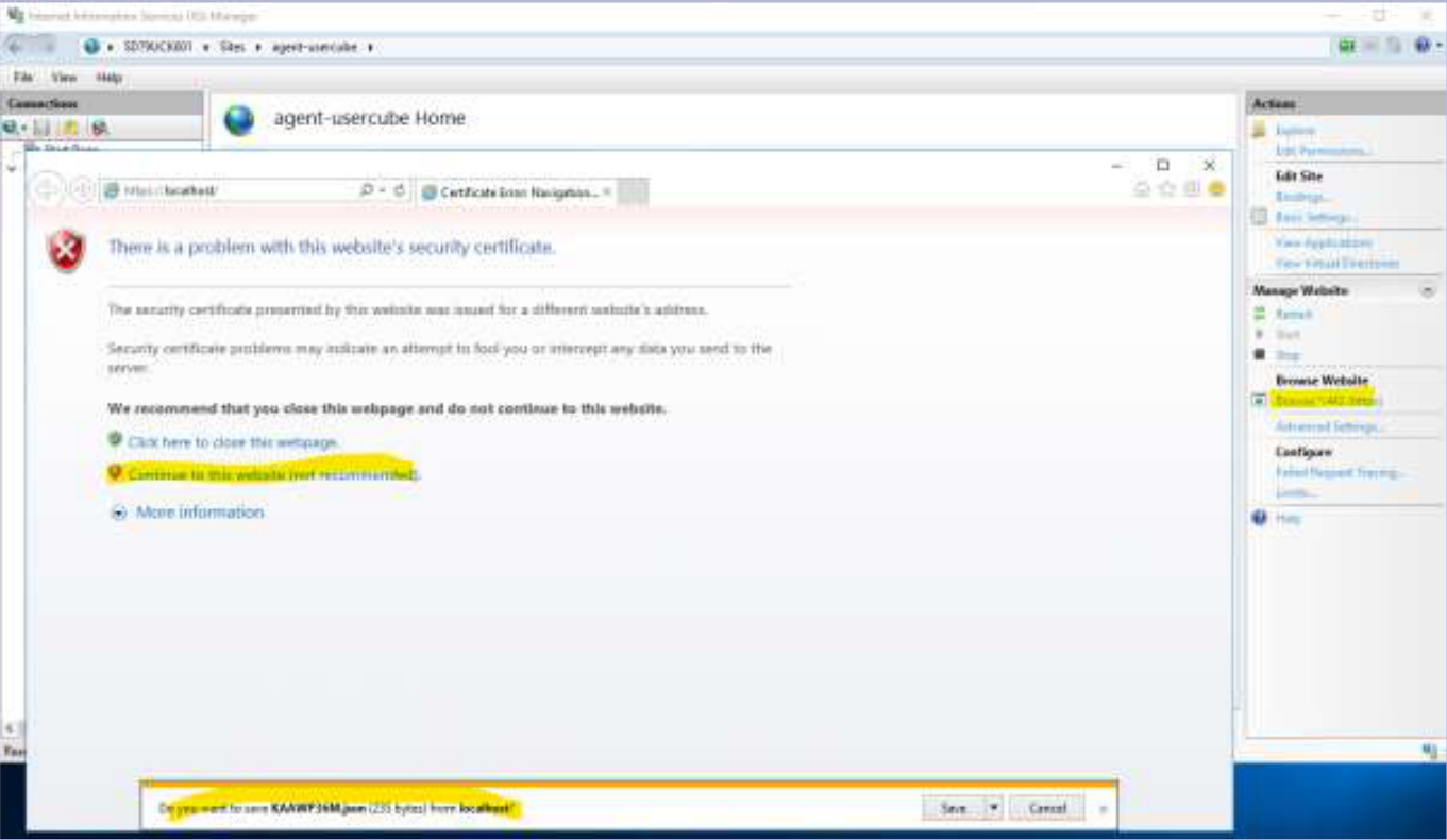 - Go to the agent’s URL to verify that it is running: to do this, select the site as before and click on Browser *:443 (https) in the right-hand menu (confirm the site in the browser page that opens, and click Save to retrieve the generated *.json file)