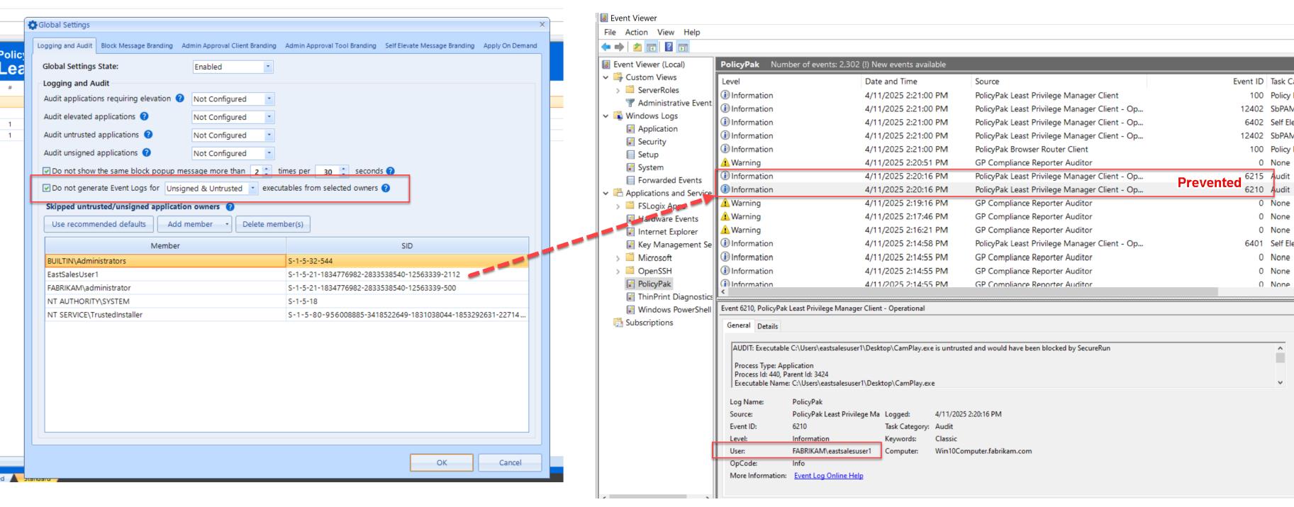 When EPM SecureRun is NOT enabled, it will automatically generate 6210 events for non-trusted items an 6215 events for non-signed items. New feature in EPM Global Settings policies enables you exempt out known good identities (like a user or group) from generating 6210 and/or 6215 events before SecureRun is turned on. Use this to pre-dial in your known good identities before turning on SecureRun to know what to expect when SecureRun is actually turned on.